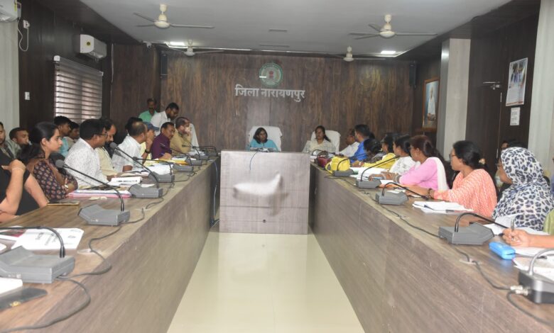 नारायणपुर, कलेक्टर प्रतिष्ठा ममगाईं की अध्यक्षता में जिला कार्यालय के सभाकक्ष में महिला एवं बाल विकास विभाग तथा स्वास्थ्य विभाग की मासिक समीक्षा बैठक आयोजित की गई। बैठक में विभागीय योजनाओं की प्रगति, आंगनबाड़ी भवनों की स्थिति, स्वास्थ्य सेवाओं की उपलब्धता और जमीनी अमले की सक्रियता की बिंदुवार समीक्षा की गई।
